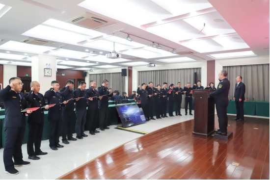 宣誓仪式在雄壮的国歌声中拉开帷幕。仪式由驻局纪检监察组组长吕栋监誓,一级巡视员翟少勇领誓。2025年新任命、提拔及职级晋升的干部代表面向国旗,肃立致敬,左手持《中华人民共和国宪法》,右手举拳,跟诵誓词。现场气氛庄重严肃,铿锵有力的誓言,充分展现了市场监管干部忠于宪法、依法履职的坚定信念和责任担当。这一仪式不仅是对新任职务的庄重承诺,更是一次对法治精神与宪法权威的崇高致敬,有效强化了干部职工的宪法意识和法治观念。
