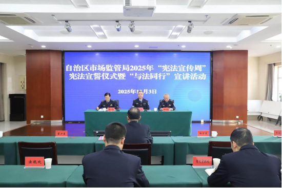 为深入学习宣传贯彻习近平法治思想,推动宪法精神深入人心,在第十二个国家宪法日暨第八个“宪法宣传周”来临之际,12月3日,自治区市场监管局举行2025年“宪法宣传周”宪法宣誓仪式,并同步开展“与法同行”主题宣讲及法治培训活动。