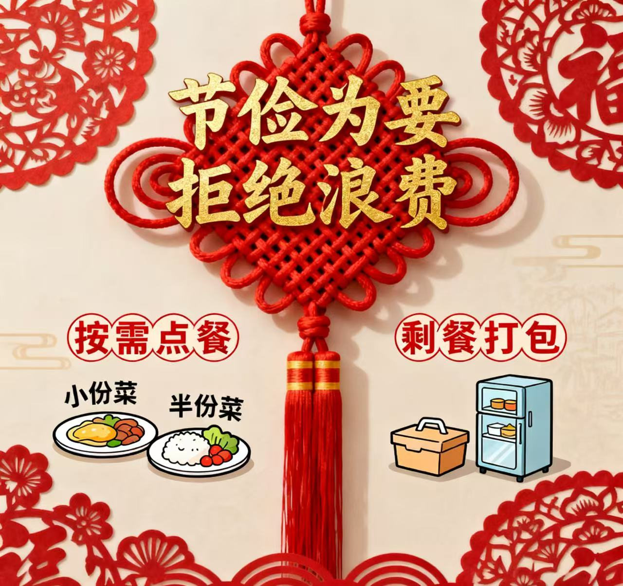 践行光盘行动:按需点餐,优先选小份菜、半份菜,剩餐科学打包、及时冷藏,采购生鲜也别囤积,避免浪费。