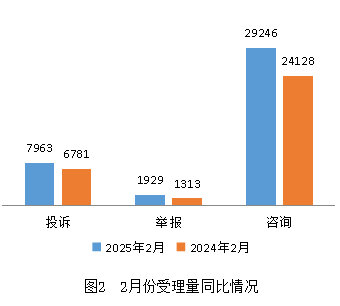 2月份,共接到咨询29246件,均为电话咨询,同比上升21.21%。其中属于市场监管系统职责范围的咨询10639件,不属于市场监管系统职责范围的咨询18607件。属于市场监管系统职责范围的咨询排名前五位的是:消费维权知识10119件,消费服务153件,商品交易101件,网络交易99件,市场主体登记注册88件。不属于市场监管系统职责范围的咨询主要涉及单用途商业预付卡退费、家电补贴、快递服务、物流服务、物业服务、洗涤服务、旅游、通信、税务发票、欠薪、医保等。