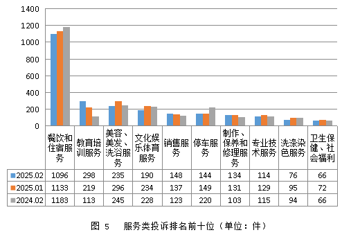 服务类投诉同比上升5.31%。投诉量排前五位的服务大类分别是餐饮和住宿服务、教育培训服务、美容美发洗浴服务、文化娱乐体育服务、销售服务,共占服务类投诉量62.79%。