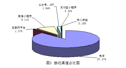 通过接收渠道情况分析,12315热线依然是群众反映诉求的主渠道,占投诉举报咨询总量87.37%。具体情况是:12315热线34195件,12315微信小程序3567件,12315APP和公众号640件,12315互联网平台536件,支付宝小程序128件,来访、来函72件。