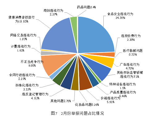 按举报问题分类,排名前五位的事项是:食品安全违法行为470件,占比24.36%;侵害消费者权益行为379件,占比19.65%;不正当竞争行为190件,占比9.85%;其他市场监管领域违法行为137件,占比7.1%;价格违法行为114件,占比5.91%。