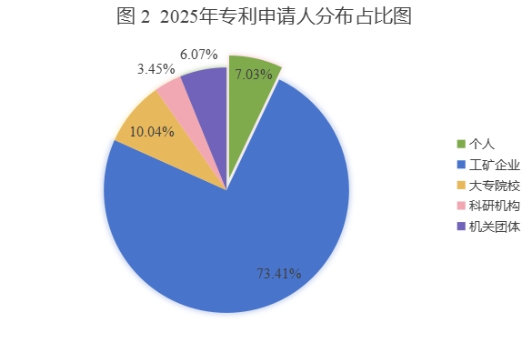 2025年,全区授权专利中,非职务(个人)专利授权1057件,职务专利授权13970件。其中,在职务专利授权中,工矿企业11031件,占比78.96%;大专院校1508件,占比10.79%;科研机构519件,机关团体912件。
