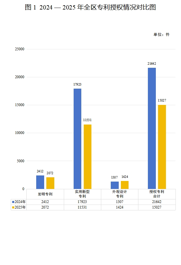 2025年,全区授权专利15027件,其中,发明专利授权2072件,实用新型专利授权11531件,外观设计专利授权1424件;国际专利申请(PCT申请)65件,同比增长27.45%;高价值发明专利拥有量4711件,同比增长18.46%,每万人口高价值发明专利拥有量从0.71提升至1.80件。截至2025年底,全区有效专利102733件,同比增长7.59%。其中,有效发明专利11966件,同比增长11.86%;有效实用新型专利85227件,同比增长7.85%;有效外观设计专利5540件,同比下降3.84%。
