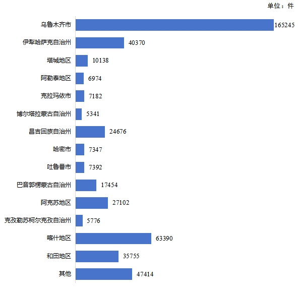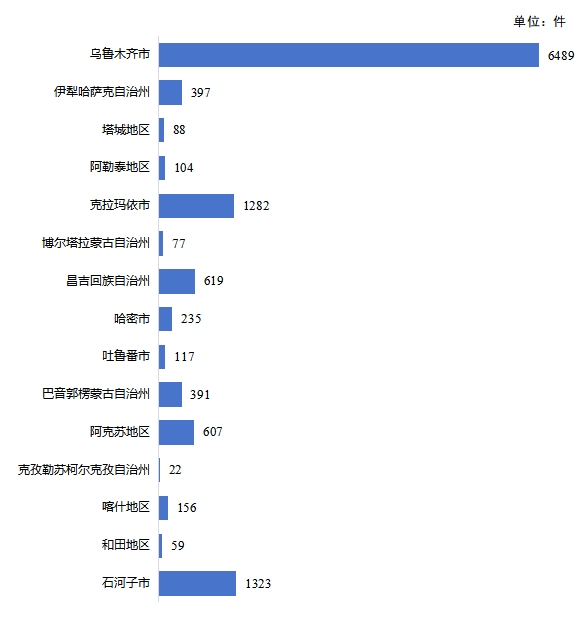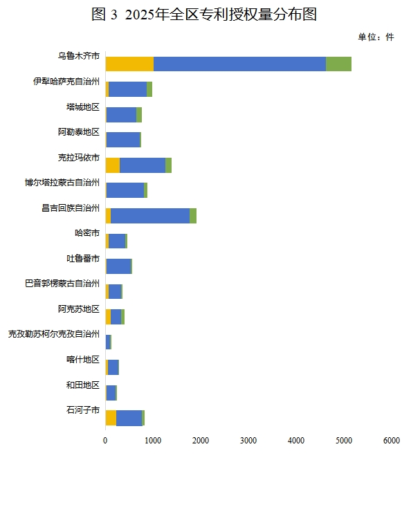 2025年,乌鲁木齐市专利授权5164件,占全区专利授权总量的34.36%,其次为昌吉回族自治州1912件、阿克苏地区1199件、克拉玛依市1020件、伊犁哈萨克自治州984件、巴音郭楞蒙古自治州920件。全区发明专利授权2072件,乌鲁木齐市1003件,占比48.41%,其次为克拉玛依市289件、石河子市235件、阿克苏地区104件、昌吉回族自治州103件。